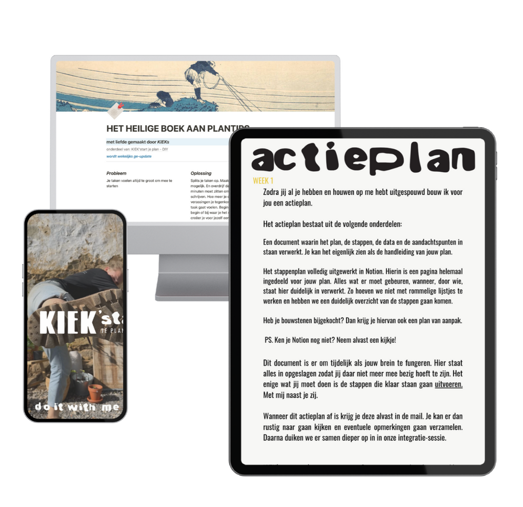 Het stappenplan waarin je samen met Kieks aan de slag gaat met je nieuwe plan. Een nieuw product, een nieuwe cursus, een nieuw bedrijf, een van die ideëen die al zo lang aan je zit te knagen. Door onder andere samen een helder overzicht maken, stappenplan uit te schrijven en wekelijks samen te evalueren, ligt er na 8 weken eindelijk een af plan op de plank.